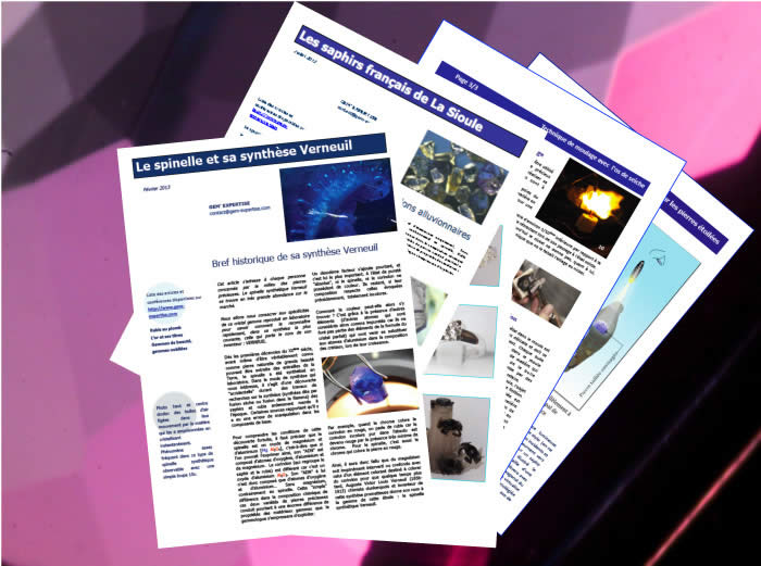 Exerçant dans ce domaine sans relâche depuis 25 ans, elle a également publié différents articles d′étude sur les gemmes, les techniques de base en gemmologie et en joaillerie, consultables sur son site ou accessibles par demande écrite. Elle rédige actuellement un ouvrage intitulé ‘©Gemmes au Logis’ et a participé à la rédaction de GEM WITH A STAR, un livre sur les effets optiques singuliers dans les pierres étoilées.