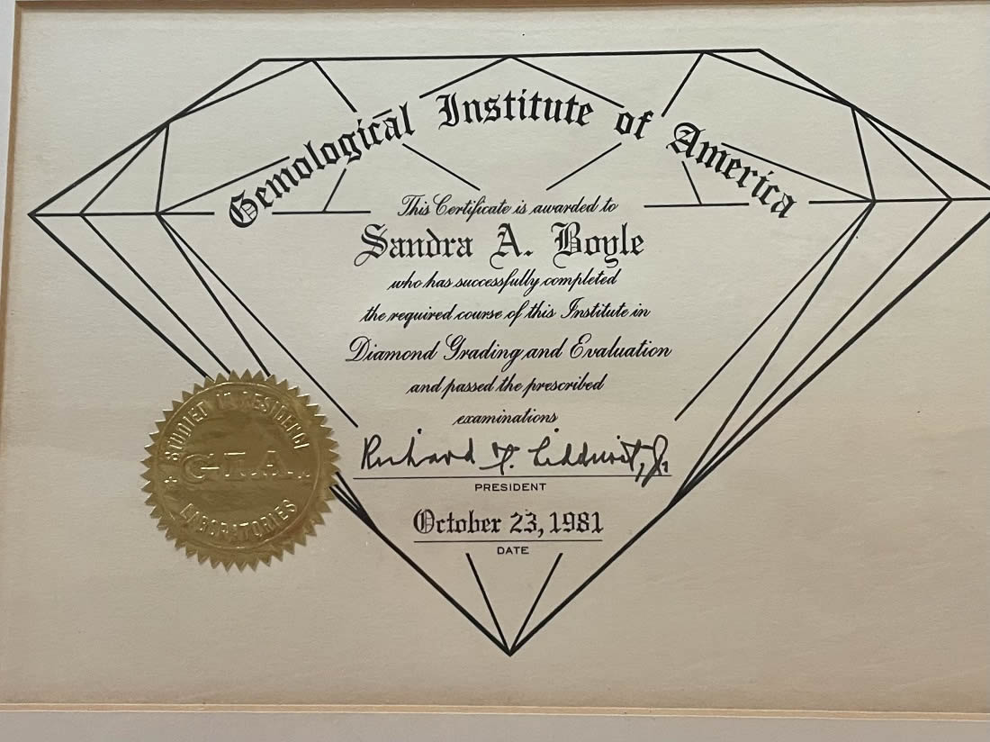 She has successfully completed the prescribed courses in gemology and appraisal methodology of the American Gem Society and also has completed the requirements to earn the title of Certified Insurance Appraiser. (CIA). Sandra has been employed in the jewelry industry for over forty years, and has been appraising independently for more than 25 years. She is a member of The National Association of Jewelry Appraisers and subscribes to a strict code of ethical standards. All appraisals are performed in conformity with USPAP requirements.
